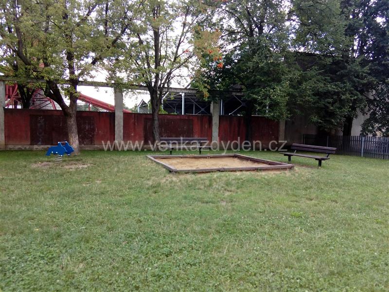 Herní prvky: pískoviště, velká lezecká pyramida, kolotoč, houpačka a horolezecká stěna, pružinová houpačka