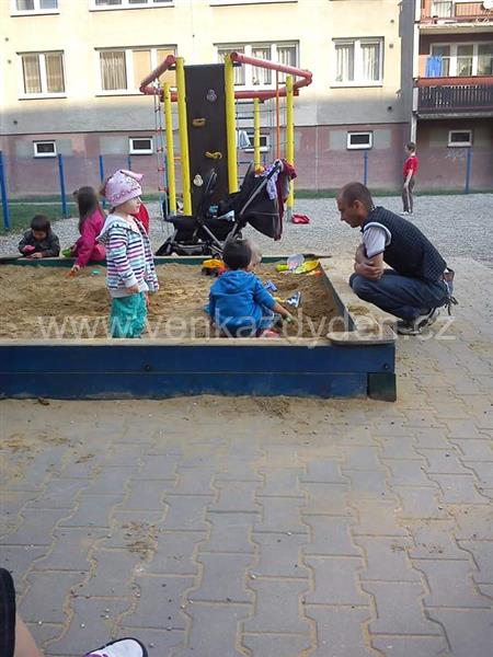 Herní prvky: houpačky, houpací zvířata, 2 pískoviště, skluzavka, síť na lezení