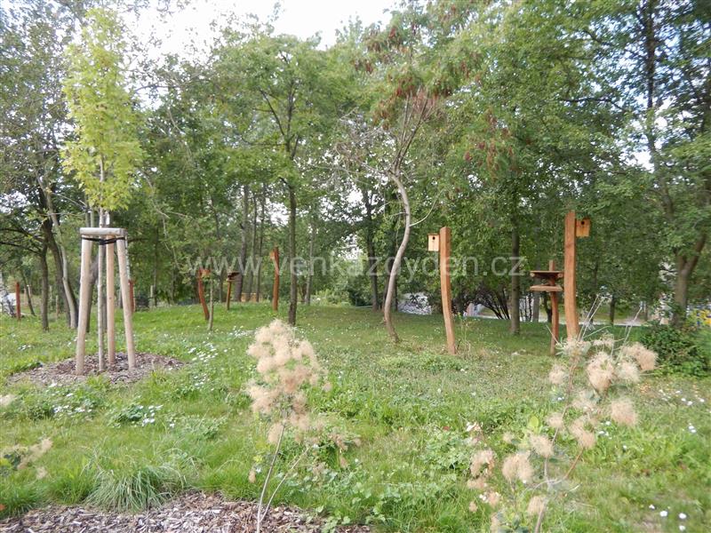 Herní prvky: Rozhledna se skluzavkou, trampolíny zabudované v zemi, svahová skluzavka, závěsné houpačky, lanovka, kladiny na pružinách, posilovací stroje, opičí dráha, prolézačka se šplhacími prvky a skluzavkou, klády s lezeckými úchyty, hřiště na petanque, stolek se šachovnicí, altán, ohniště, houpací síť, kládová houpačka, domek na pružinách, parabolické ucho, dendrofon, hrazdy různých výšek, kličkovací kůly, lanová dráha s hrazdami