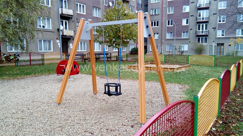 Herní prvky: Tři pérové houpačky, malá skuzavka pro nejmenší, houpačka s ohrádkou pro nejmenší, pískoviště. V dolní části horolezecká stěna, hřiště na míčové hry a houpačka pro tři děti.
