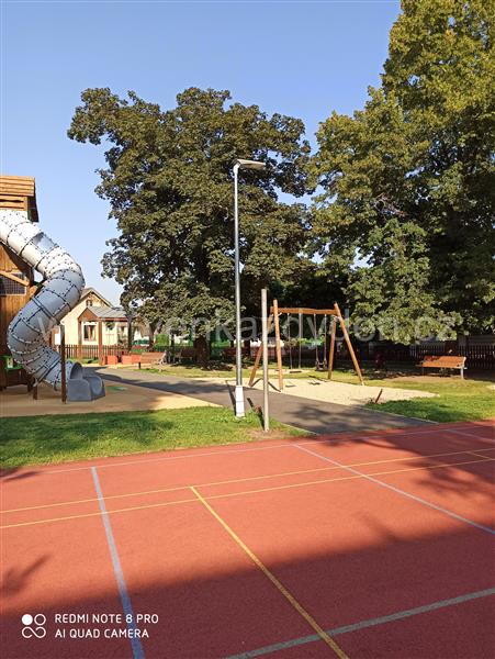 Herní prvky: Krásné kryté pískoviště s hračkami pro nejmenší, posezení, vodní prvky- rosení a dětské "pítko". Velký domeček s prolézačkou ,tobogánem a dalekohledem. Kopec s klouzačkami, 2 houpačky, pružinová houpadla zvířátka pro nejmenší, kolotoč, dětská lanovka, lavičky. Kurt na míčové hry. Hřiště oploceno.
