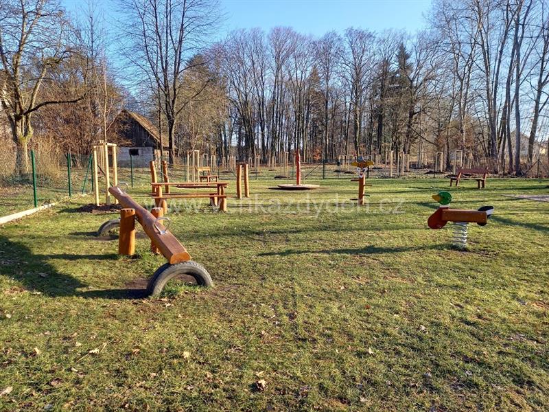 Herní prvky: sestava se skluzavkou, houpačky, kolotoč, lezecí jehlan, posilovací hrazdy