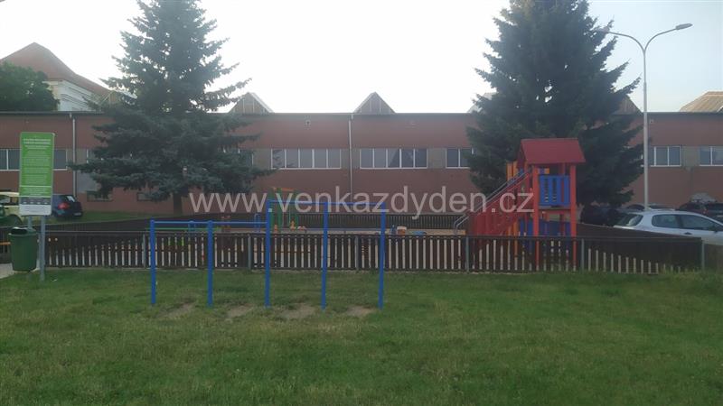 Herní prvky: hrazdy, houpačka, pískoviště, skluzavka
