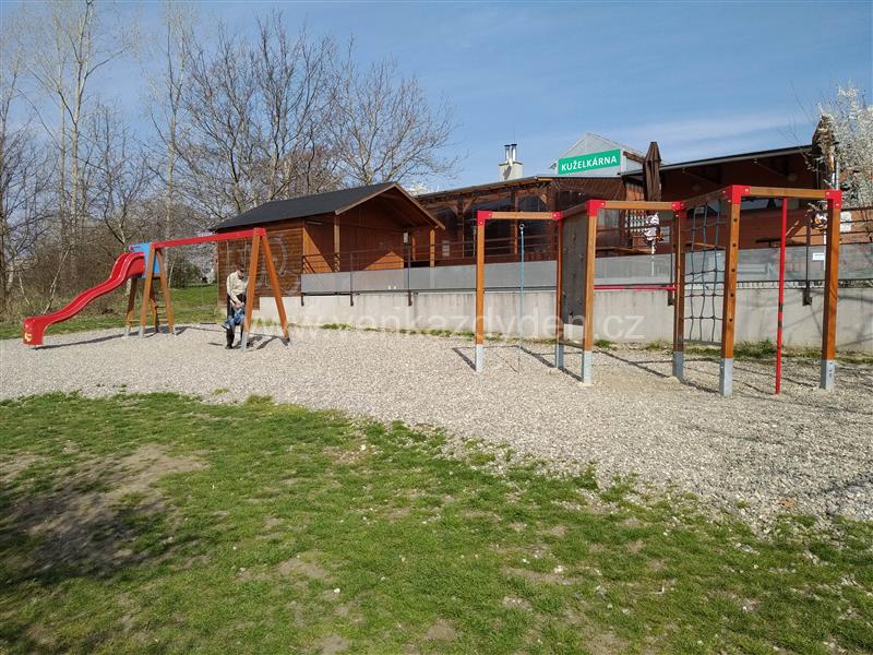Herní prvky: 2x závěsná houpačka, skluzavka, prolézací sestava s lanovými prvky, horolezeckou stěnou a tyčí