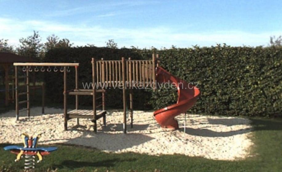 Herní prvky: lanová pyramida, skluzavka, houpačky, průlezky