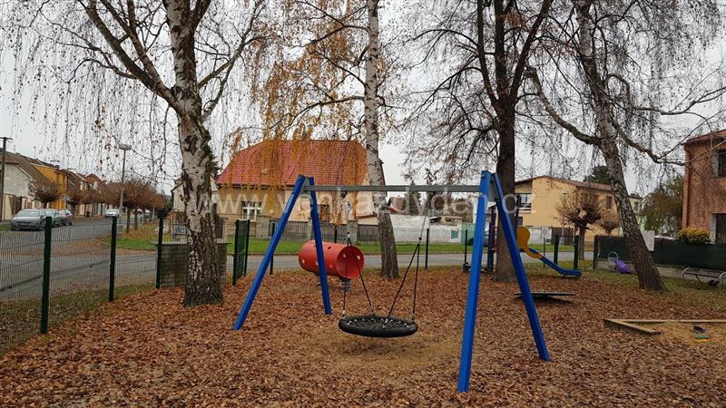 Herní prvky: skluzavka, houpačka, pískoviště, lezecí most