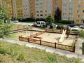 Menší oplocené hřiště se skluzavkou, houpačkami a pískovištěm.