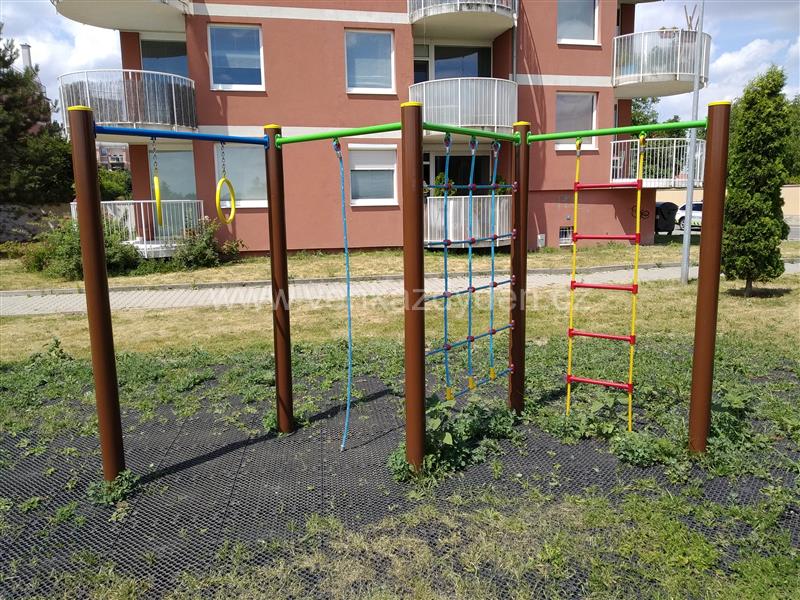 Herní prvky: 1x velká provazová pyramida, 2x menší provazové pyramidy spojené dohromady, závěsné houpací hnízdo, prolézačka s lanovými prvky a kruhy na cvičení, skluzavka s lanovými žebříky. Piknikový stůl s lavicemi, lavičky, odpadkový koš.