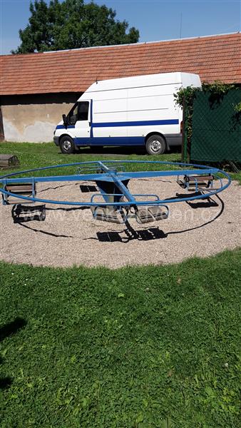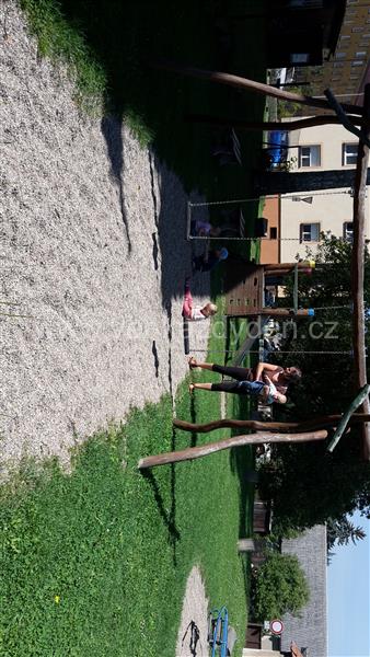 Herní prvky: klouzačka s prolézačkou, pískoviště, kolotoč, 2x klasická houpačka, 1x vahadlová houpačka, pružinové houpadlo, nízké lano, klády na lezení