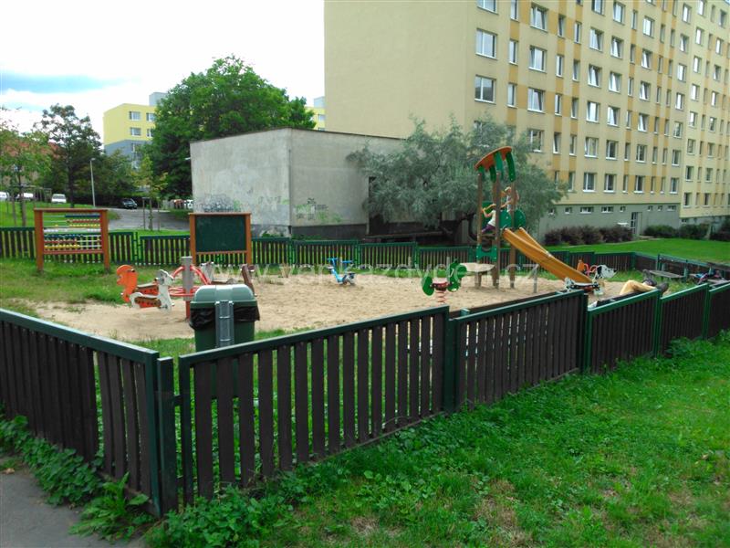 Dětské hřiště mezi panelovými domy s písečným povrchem (místy již zarůstá trávou), oplocené, dostatečný počet laviček, odpadkový koš. Kousek od hřiště je oplocené asfaltové hřiště vhodné na míčové sporty.