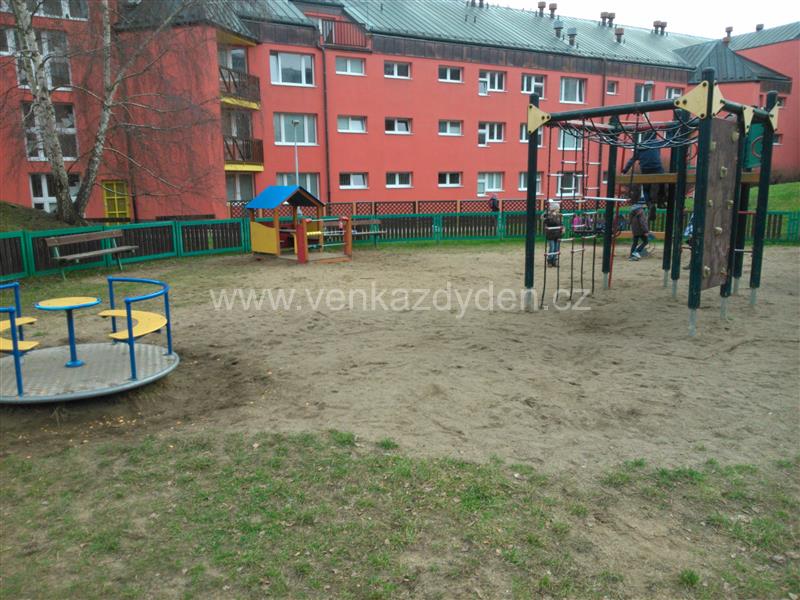 Herní prvky: kolotoč, dřevěný domeček na hraní s kuličkovým počítadlem, houpačka pro dva, prolézací sestava s lanovými žebříky a horolezeckou stěnou, velká prolézací sestava s lanovými prvky a skluzavkou, velká kyvadlová točící houpačka pro dva