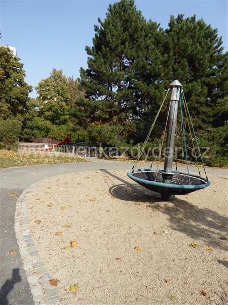 Pěkné dřevěným plotem oplocené hřiště se skluzavkou, houpačkou a hopsadly pro malé a nad tim slunné prolézačkové pro větší děti.
