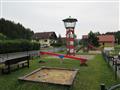 Herní prvky: Vahadlová houpačka, pískoviště, stěna s pavoučí sítí a skluzavka, houpačky