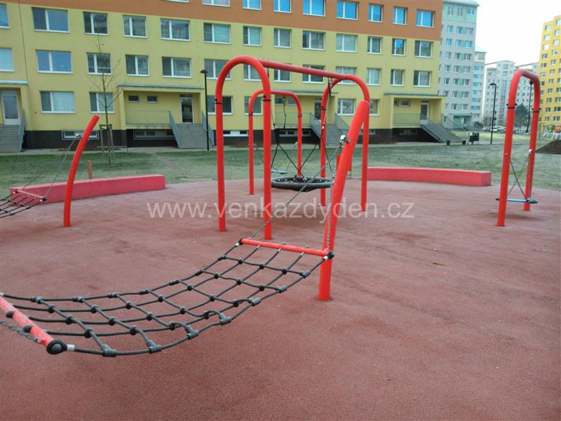 Herní prvky: 2x závěsná houpací síť, 2x houpací plošina ke stání včetně lana na držení, 1x závěsný houpací koš