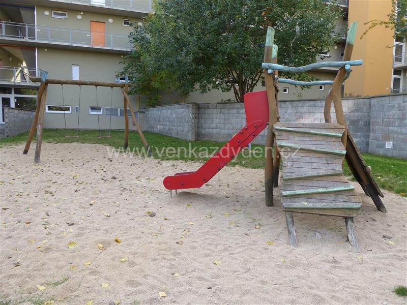Herní prvky: Prolézačka s lezeckými chyty a se skluzavkou, houpačky, hopsadlo