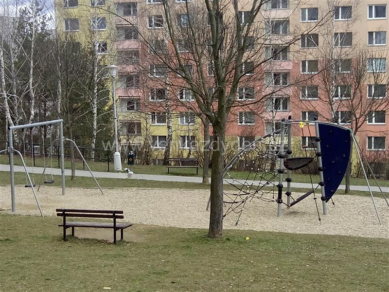 Basketbalové oplocené hřiště a neoplocené průlezky s houpačkami.
