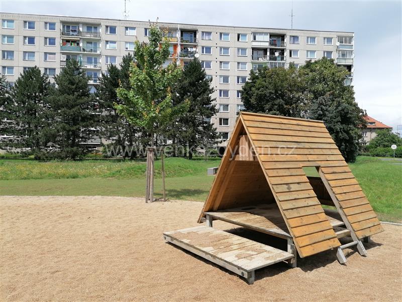 Herní prvky: Dřevěná věž s kyblíkem a trychtýři, pohupovačka, stěna na lezení, domeček.