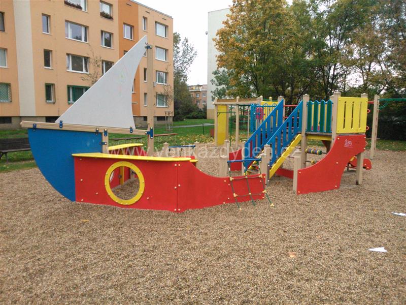 Herní prvky: 2x závěsná houpačka, provazová pyramida, dřevěná prolézací loď s kapitánským můstkem a malou skluzavkou, prolézací sestava s velkou skluzavkou a tyčemi na ručkování, prolézací sestava s provazovým žebříkem a horolezeckou stěnou