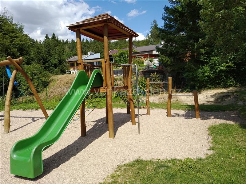 Herní prvky: kolotoč, provazový most, 2x pružinová houpačka pro jednoho, 2x pískoviště se zakrývací plachtou, kladinová houpačka, 2x závěsná houpačka, závěsné houpací hnízdo, věž s lanovými prvky se skluzavkou a kovovou tyčí, 2-dílná hrazda