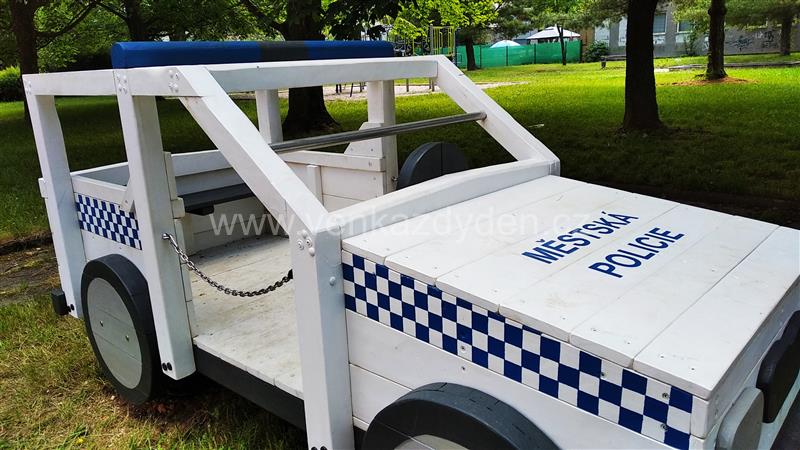 Herní prvky: pískoviště, 2 prolézačky, houpací policejní autíčko
