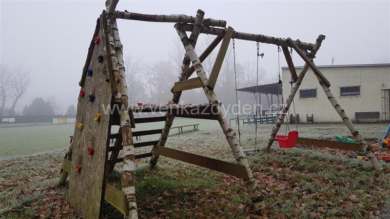Herní prvky: skluzavka, houpačky, lezecí stěna, pískoviště