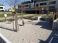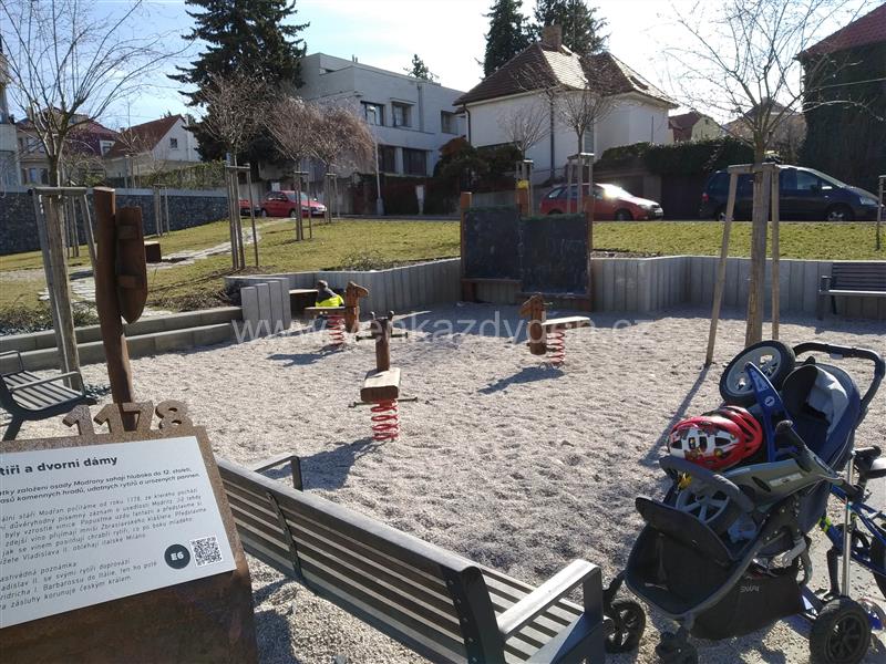 Nově vybudované dětské hřiště mezi novostavbou obytných domů. Situováno v klidném vnitrobloku. Tvořeno oblázkovou částí s pružinovými houpačkami a tabulí, kousek dál na trávníku umístěna závěsná houpačka.