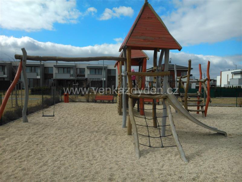 Herní prvky: 3x závěsná houpačka, 2x pružinová houpačka pro jednoho, kolotoč, pískoviště, 2x točidlo, kladinová houpačka pro dva, velká prolézací sestava se skluzavkou a řetězovým mostem
