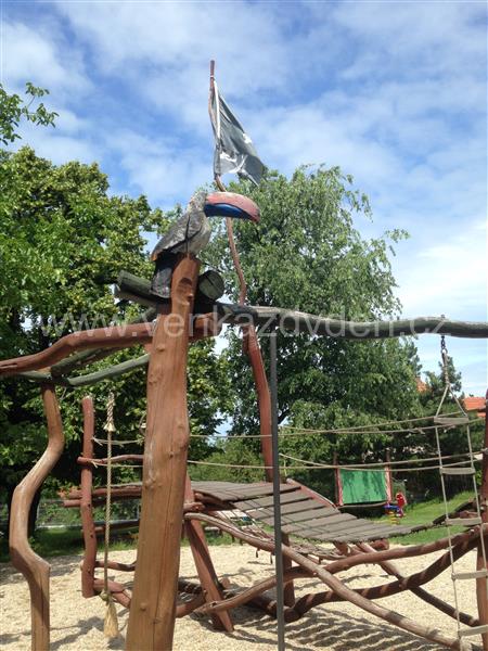 Herní prvky: Klouzačka, dvě houpadla na pérách, 2 houpačky pro větší děti, 2 houpačky pro menší děti, pískoviště, šplhací lano, šplhací žebřík, šplhací tyč, tabule, houpací kotva, houpačka pro 2, lanová síť,