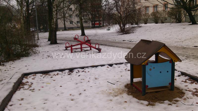 Malé dětské hřiště mezi domy v ulici Maříkova.