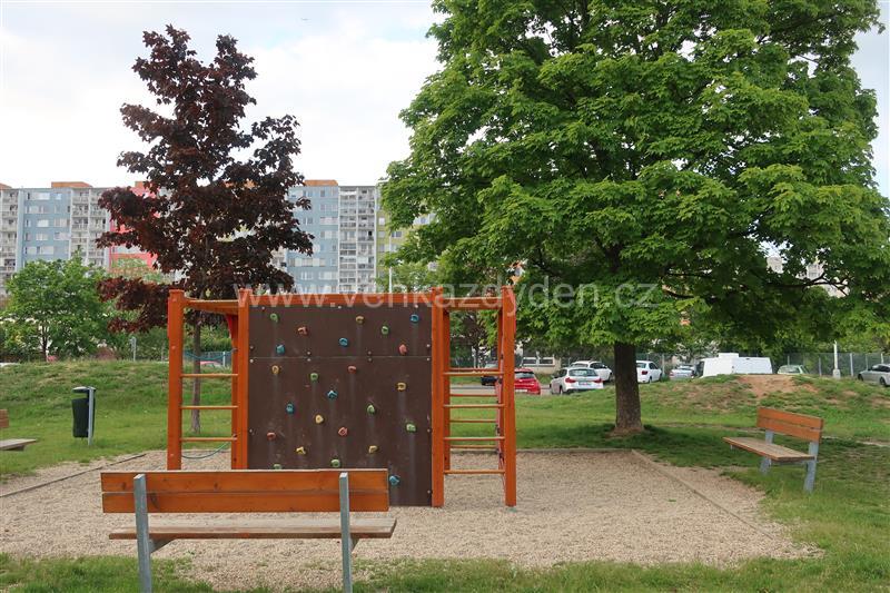 Herní prvky: prolézačka, pískoviště, skluzavka, houpačka s pneumatikou, tabule na malování, domeček, vahadlová houpačka, pružinová houpačka
