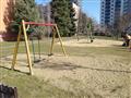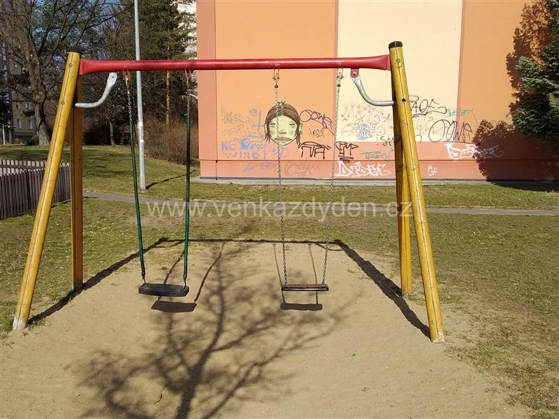 Herní prvky: 2x závěsná houpačka, velká kývací a točící houpačka, velká točicí plocha