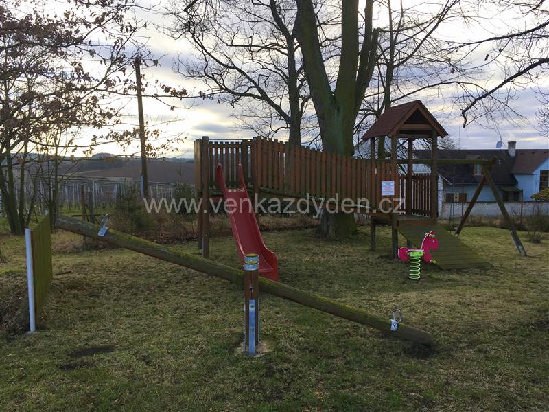 Herní prvky: 1x domek se skluzavkou, 1x houpací koník, 1x houpací tyč, 1x houpačka