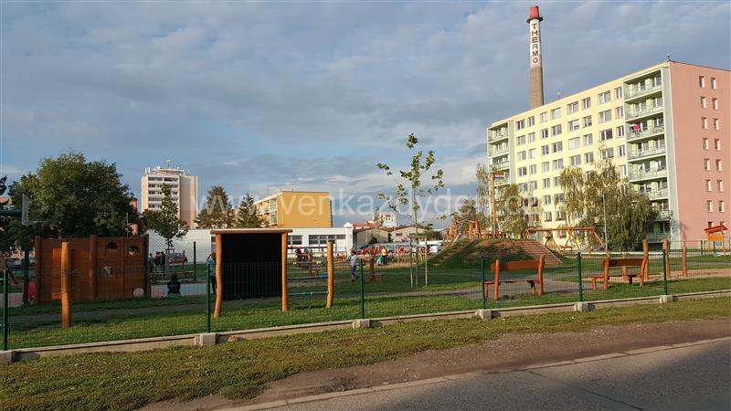 Venkovní hřiště po nedávné rekonstrukci. Houpačky, skluzavky, lanovka atd. K dispozici je i minibasketbalový a basketbalový koš, trampolína atd.