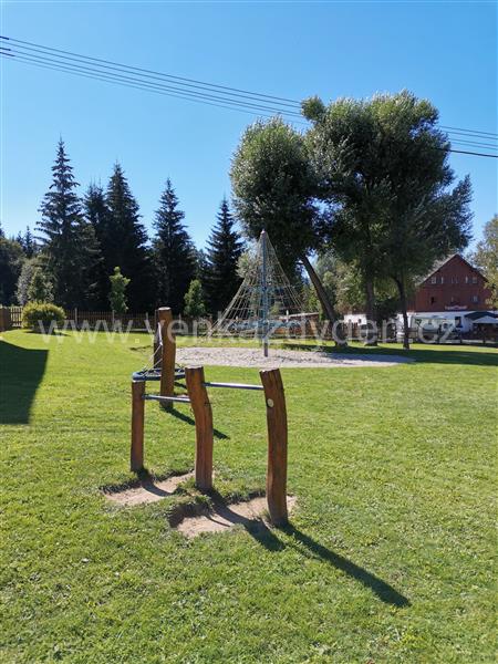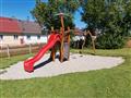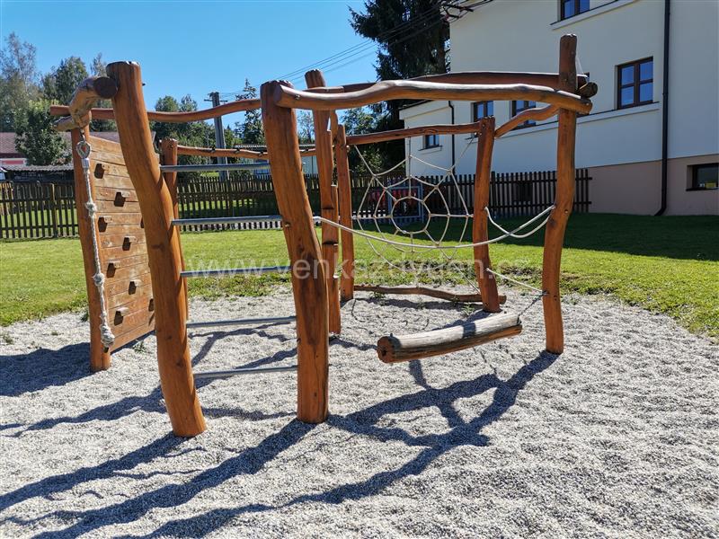 Herní prvky: Houpačky Lanová pyramida Skluzavka Prolézačky Lezecká stěna Posezení pod přístřěškem
