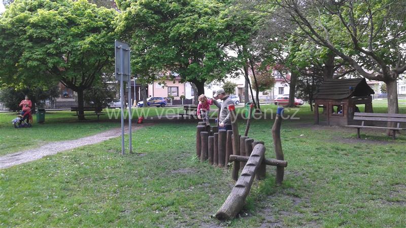 Herní prvky: skluzavka, houpačka, provazová překážka, balanční dráha