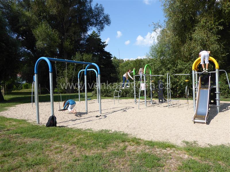 Pyramidová lanová prolézačka, houpací kruh, houpačky i prolezačky, které přelézt celé bez dotyku se zemí je výzva najdete v parčíku u dřevěné lávky přes řeku Svitavu v jihovýchodní části Cacovického ostrova, blízko ulice Říční. Nejbližší zastávka Selská.
