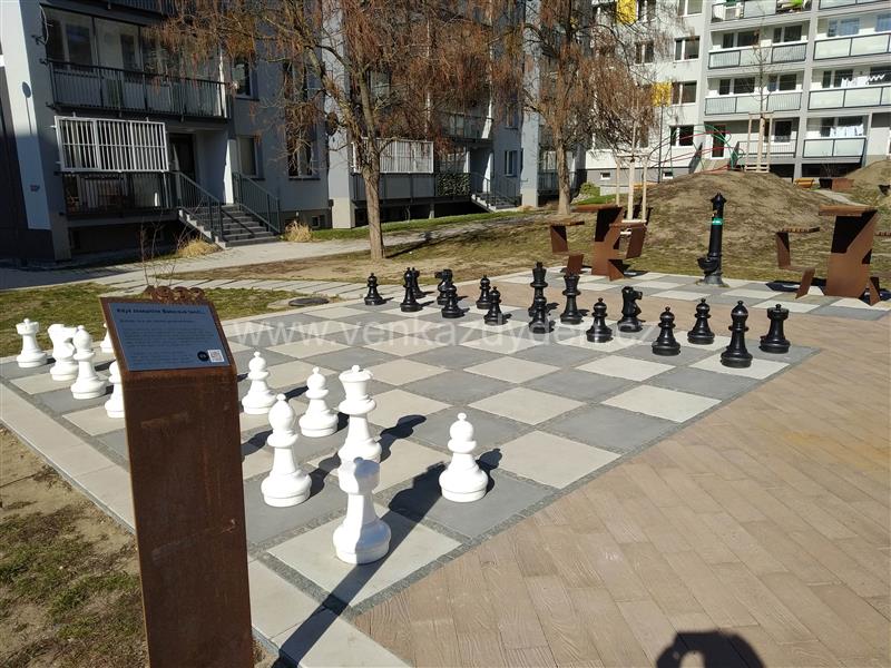 Velké pozemní šachové hřiště s figurkami, kolem kterého je umístěno několik stolků s židličkami pro hraní šachů a jiných společenských her - vše pod širým nebem. Situováno v klidném a příjemném parku mezi obytnými domy. Součástí hřiště je i pítko s pitnou vodou.
