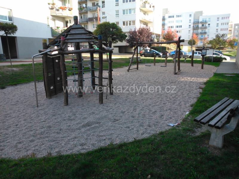 Pěkné a udržované hřiště s dřevěnými herními prvky v zeleni před panelovými domy.