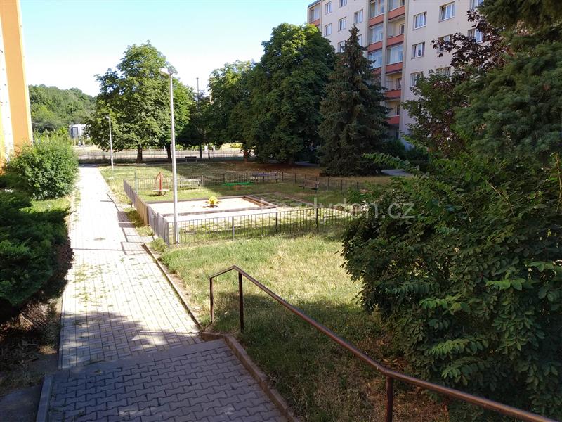 Pěkné dětské hřiště v zeleni mezi činžovními domy.