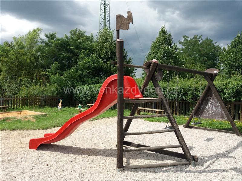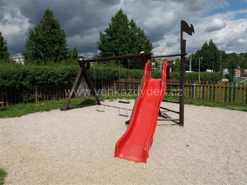 Herní prvky: Skluzavka, dvě klasické houpačky, dvě pružinové houpačky, pískoviště, tabule na psaní