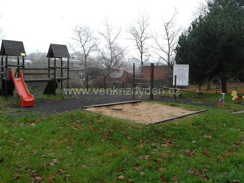 Herní prvky: skluzavka, houpačky, prolézačky, pískoviště