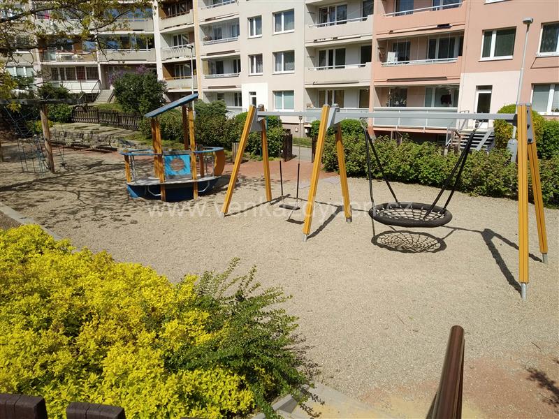 Herní prvky: pískoviště, houpačka pro jednoho na spirále, závěsné houpací hnízdo, 1x závěsná houpačka, prolézačka ve tvaru lodi, lanová prolézačka, 3-dílná hrazda, horolezecká stěna, 2x plechová skluzavka zabudovaná do svahu