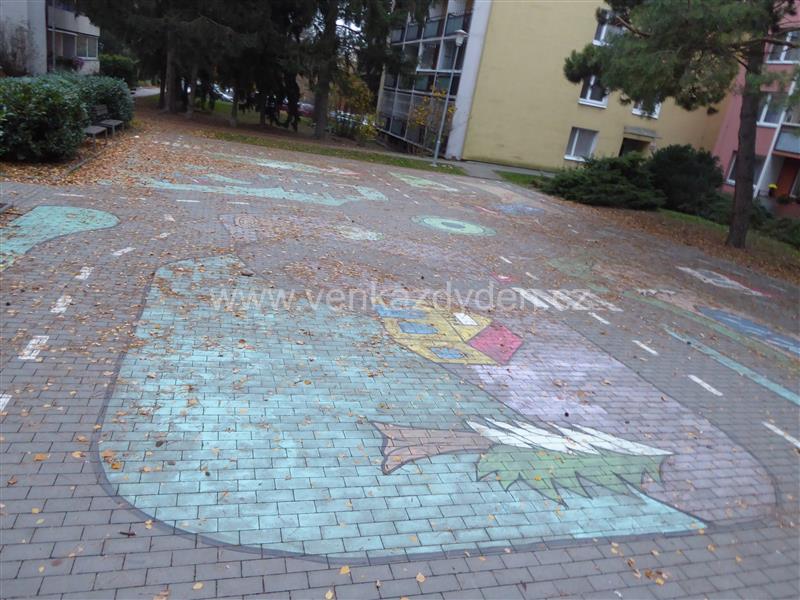 Betonový plácek využitý pro malované dopravní hřiště pro nejmenší. Idealní pro odrážedla a malá kola.