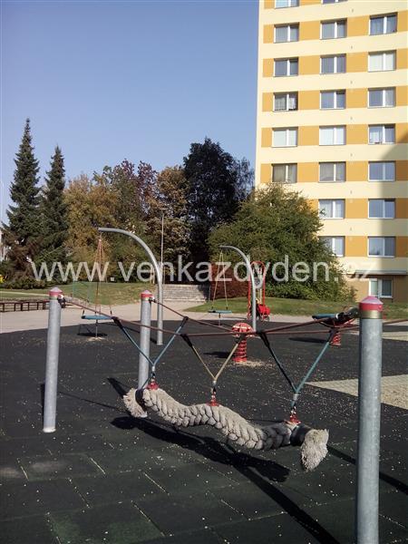 Kamínkové hřiště s lanovou pyramidovou prolézačkou, kruhovým houpadlem, pružinovou houpačkou pro dva, hopsadlem v klidném vnitrobloku. U zastávky busu Kořískova, nad mateřskou školkou.