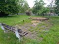 Posilovací stroje u domova pro seniory, částečně oploceno.