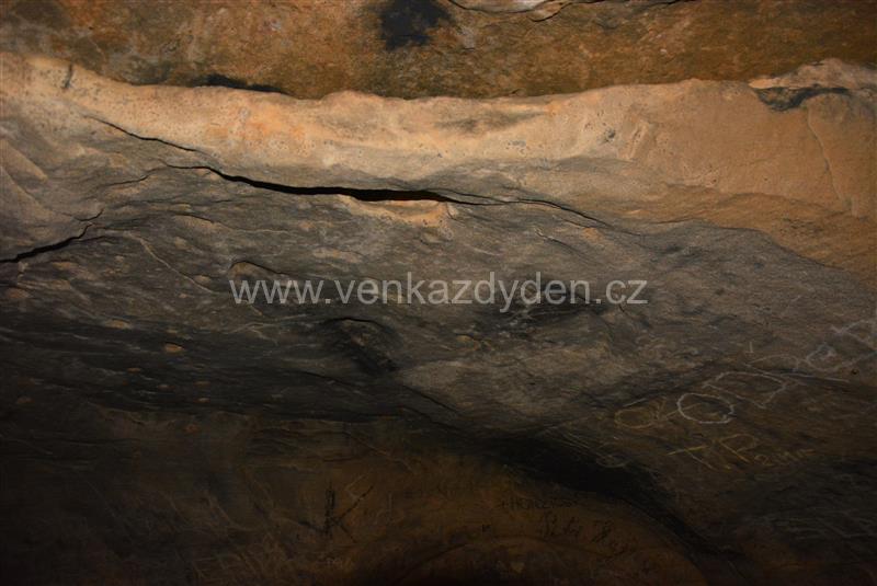 Odtud už pokračujeme směrem doprava po žluté nejdříve směr jeskyně Postojna (je zde rozcestník, který nás rychle zorientuje a hlásí, že k jeskyni je to 1 km). K jeskyni se jde pohodlně převážně po vrstevnici, většinou písčitou cestou lemovanou borůvčím, kde nás potěší spousta borůvek. Až na konci nás čeká krátké klesání s dřevěnými schody. Jeskyně Postojna vypadá jako skalní převis s menším otvorem, ale díky informační tabuli jsme si jistí, že jsme na místě. Otvorem se po čtyřech nasoukáme dovnitř, kde nás čeká překvapivě velký prostor, v kterém lze již normálně stát a chodit. Je zde tma, takže všem doporučujeme posvítit si alespoň mobilem nebo ideálně vzít čelovky. Na stěnách jeskyně jsou četné vyryté značky a nápisy. Když už jsme dostatečně zchlazení, vycházíme ven a vracíme se zpět po žluté. Cestou míjíme i restauraci, kde si lze dát od pití přes zmrzlinu i nějakou tu hotovku. Posedět lze i venku, pro děti je zde pískoviště a malý nafukovací bazének. Je možné použít také budku chemického wc.