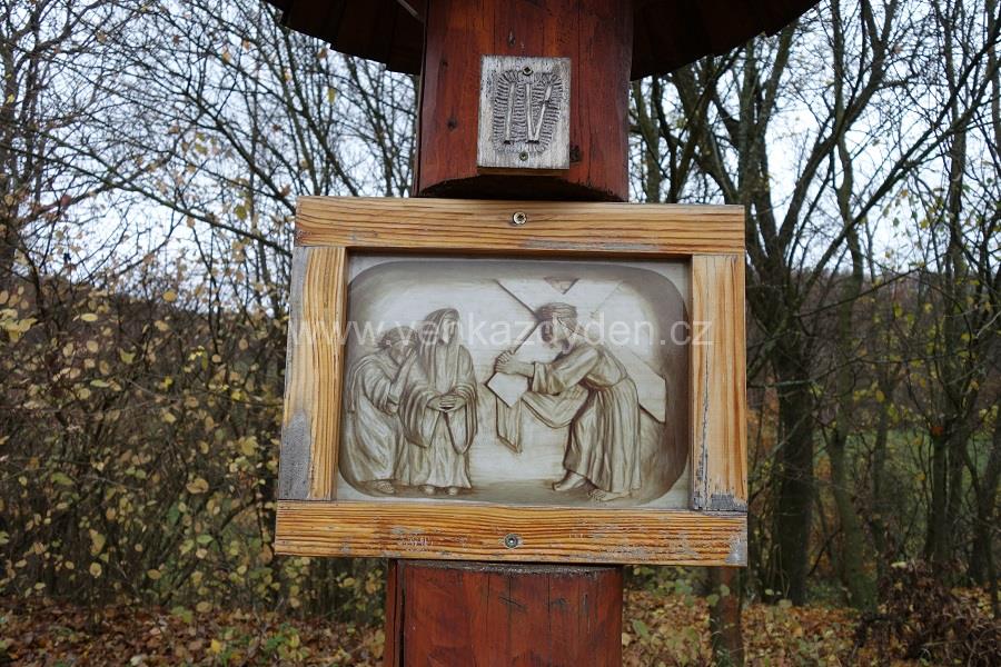 Křížová cesta začíná hned nad posledními obecními domy. Cesta má celkem čtrnáct zastavení, která jsou rozmístěno podél zpevněné cesty, která vede nahoru. Za křížovou cestou vede cesta k návrší, který se jmenuje Vinohrádek. Jednotlivá zastavení jsou vyobrazené stejně prostě, jaký v minulosti býval život zdejšího lidu: skládá se z dřevěného sloupu s pěknou kulatou doškovou stříškou, pod níž je na kmeni umístěna deska ze dřeva. Všechny výjevy jsou vyřezané do dřeva, tj. do materiálu, který je pro Kašavu typický.