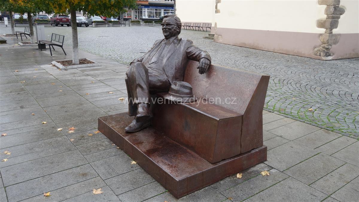 V samém epicentru velkého Masarykova náměstí nedaleko katolického kostela svatého Vavřince najdete litinovou lavičku s realistickou sochou českého spisovatele Josefa Škvoreckého. Spisovatel je v nadživotní velikosti a je ztvárněn v uvolněné póze, která byla pro něj typická. Podíváme-li se bedlivě, najdeme na lavičce a podstavci úryvky textů z autorových známých knih.