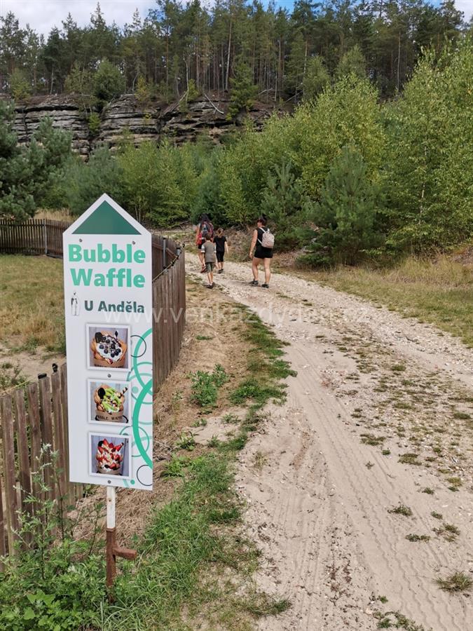 Vrátíme se na značenou cestu a pokračujeme kolem kříže, za ním vpravo. U kříže jsme se chvíli zdrželi, protože jsme zde obdivovali bažiny. Pak opouštíme značenou cestu, přeběhneme silnici a jdeme po cestě do kopce až za první stavení a tam čeká překvapení v podobě Bubble Waffle U Anděla, kde dělají veliké a výborné vafle. Můžete si vybrat náplň, ovoce, zmrzlinu či posyp dle svého gusta. Odsud se můžeme vrátit na červenou a pokračovat dále směrem na Chrby nebo se vrátit zpět k hradu.