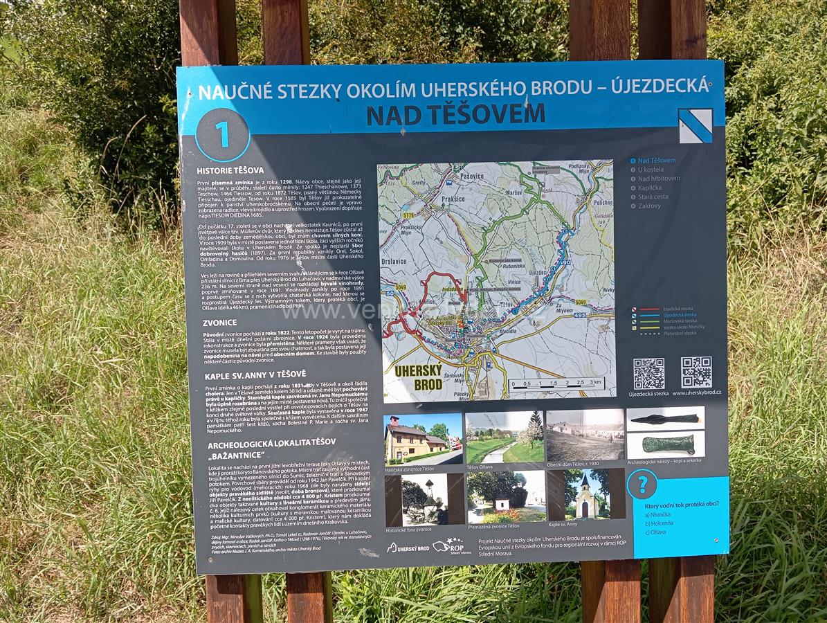 Újezdecká stezka vám zajímavou formou přiblíží dějiny místních částí Uherského Brodu – Těšova a Újezdce. Na všech šesti panelech se seznámíte se s legendami o jejich vzniku, s místním nářečím i s dějinami místního lidového kroje. Pozoruhodná je i zdejší archeologická lokalita a rozmanitá škála rostlin, květin, keřů a živočichů. Na naučné stezce je rovněž k dispozici dalekohled, kterým můžete sledovat malebná panorama Bílých Karpat. Je vhodná nejenom pro pěší, ale také pro cyklisty. Je prakticky schůdná za každého počasí.